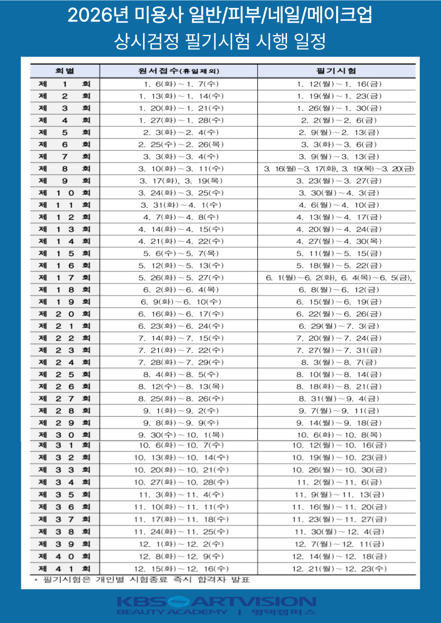 2026년 상시 필기 시험 시행일정 페이지 정보 작성자 평택캠퍼스 작성일25-12-23 16:30 조회114회 댓글0건 관련링크 이전글 다음글 목록 본문 안녕하세요 ~KBS아트비전미용학원 평택캠퍼스입니다.2026년도 미용사 필기 시험 일정표 공유해드립니다. 이전글 다음글 목록